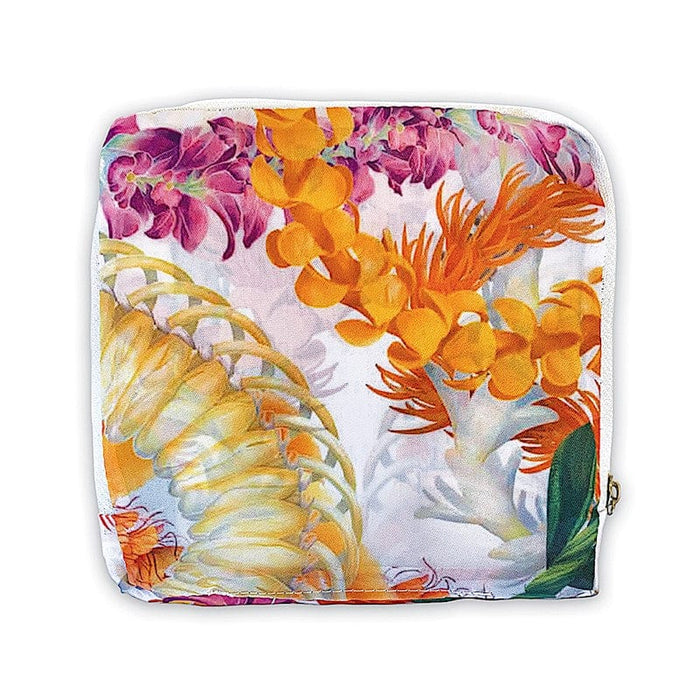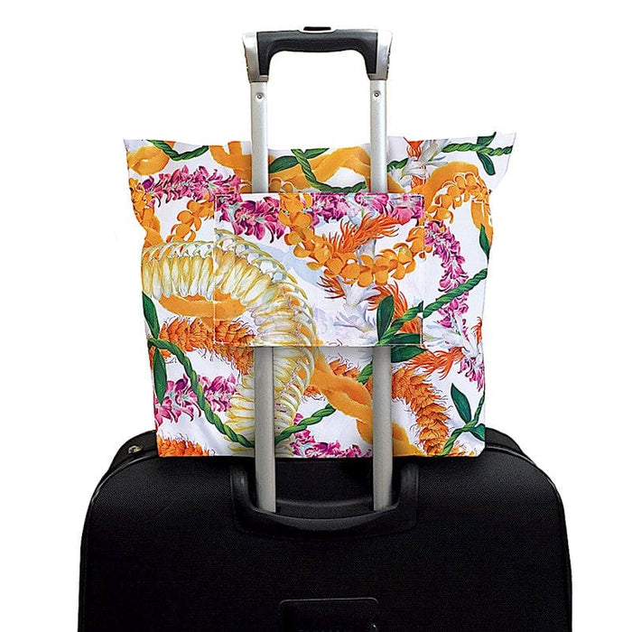 Help reduce the use of plastic and paper bags with this handy Leis of Aloha tote. These colorful, stylish and practical foldable totes are made of 400D polyester that is lightweight and durable. Folds into its own square pouch for easy storage and travel. This convenient tote has a front zip pocket and can be attached to a suitcase. Folded pouch measures approximately 6” x 6”. Tote measures approximately 20.75” x 15” x .25”.