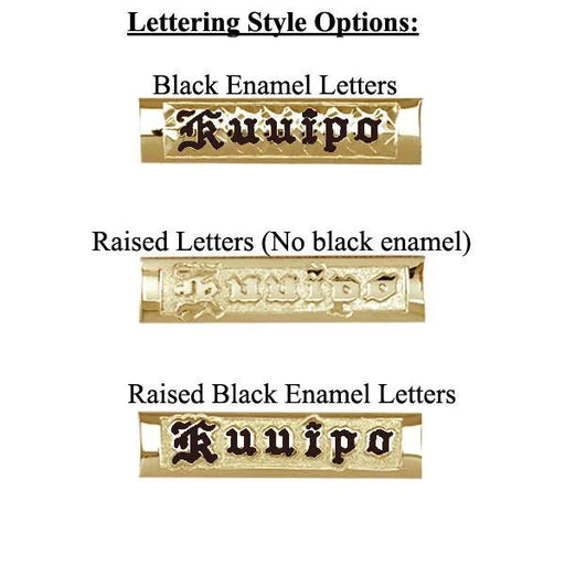 14K Yellow Gold Custom Hawaiian Vertical Pendant hand carved with Plumeria on top of the name. 1.25mm in thickness. You may have up to 10 letters o...