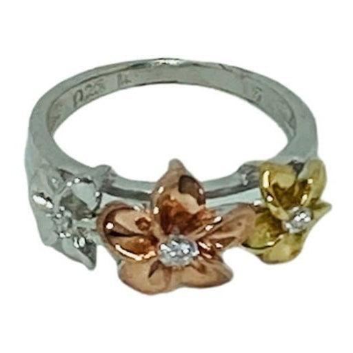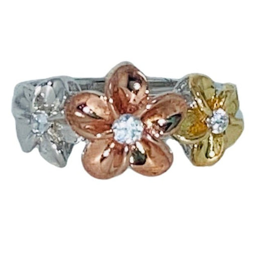 Dainty 6-8-6mm Sterling Silver Tri-Color and Rhodium Plated Three Plumeria Ring with Clear CZ