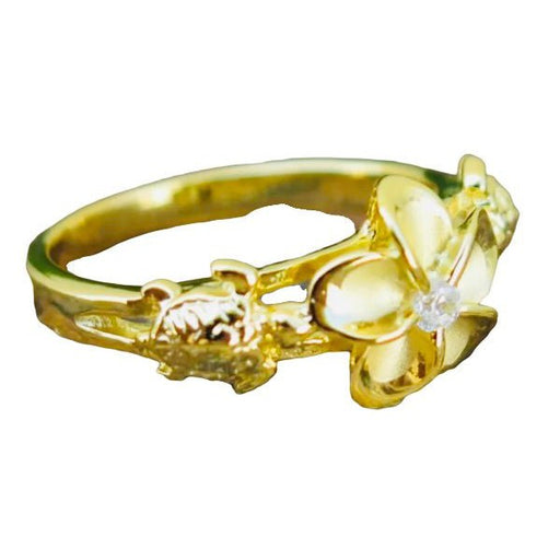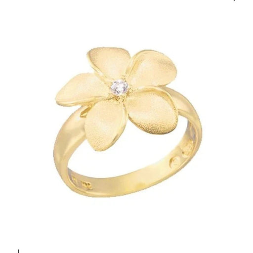 This dainty sterling silver gold tone and rhodium plated ring features a 14mm plumeria with a clear CZ in the center of the flower.