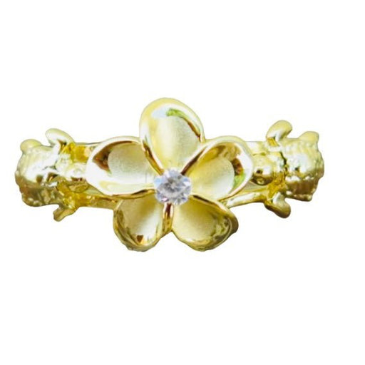 This dainty Sterling Silver gold tone and rhodium plated ring features a 8mm plumeria with a clear CZ in the center of the flower.  The centered fl...