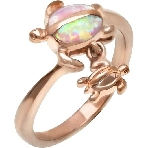 This dainty sterling silver rose gold and rhodium plated ring features an opal inlay mama honu with her dangling baby at her side.