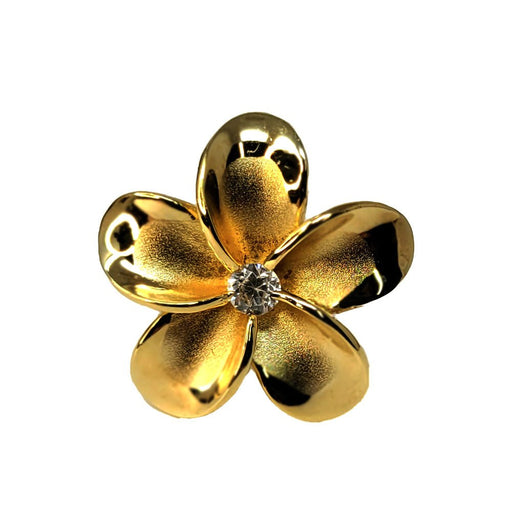 This Gold and rhodium plated ring features a 22mm plumeria with a clear CZ in the center of the flower.