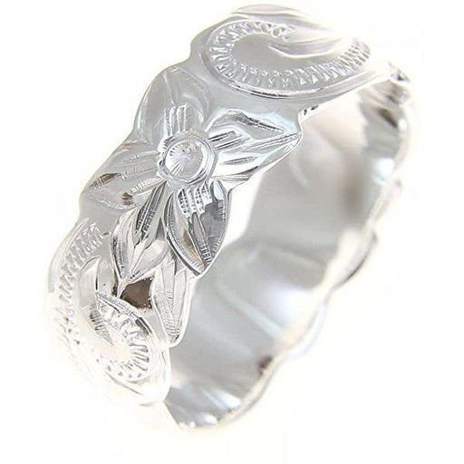Sterling Silver 8mm Hawaiian Plumeria and Scroll Ring with Cut-Out Edge. The 8mm ring is made with sterling silver and high polished to avoid tarni...