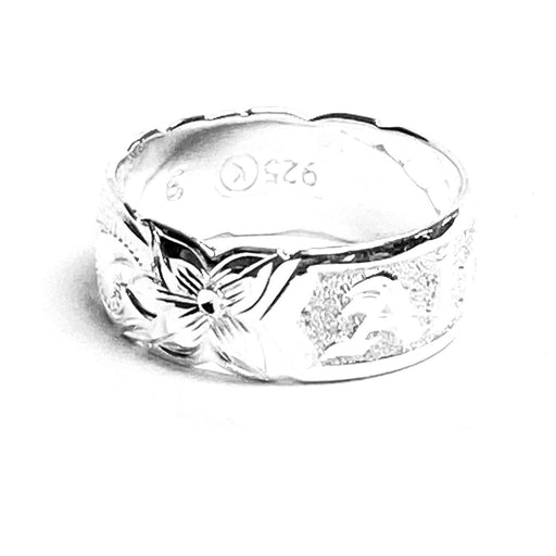 Sterling Silver 8MM Hawaiian Plumeria and Scroll Ring with Coin Edge