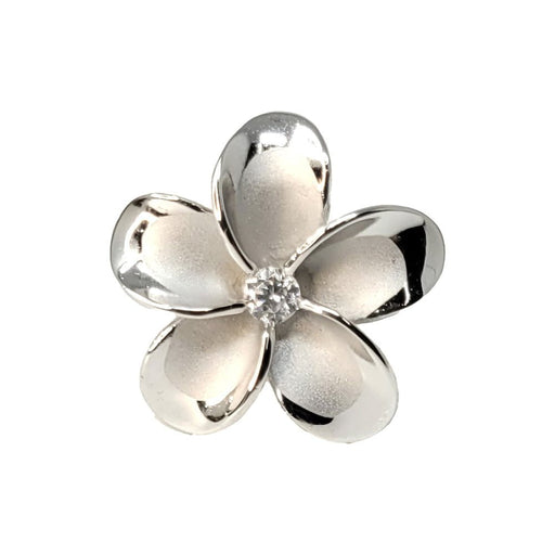 This dainty sterling silver and rhodium plated ring features a 14mm plumeria with a clear CZ in the center of the flower.