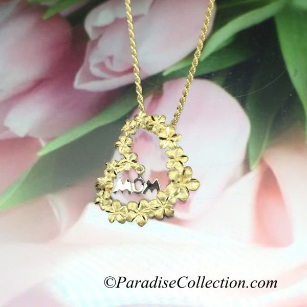 14KT Yellow Gold Plumeria Heart Leis with "MOM" Pendant