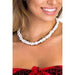 Capture the beauty of the Hawaiian sea with this stunning white rose clam shell necklace. The necklace features a delicate strand of small, irregular white shell pieces, creating a textured and natural appearance. Each piece of shell is uniquely shaped, reflecting the organic beauty of the ocean. The necklace appears to be choker length, sitting close to the neck for a stylish, beach-inspired look. Its intricate design adds a touch of elegance to any outfit, making it perfect for a fun-filled day on the beach or as a chic accessory for coastal-themed events. This necklace combines the raw beauty of natural materials with a refined aesthetic, offering wearers a piece of Hawaiian charm. Ideal for those who appreciate ocean-inspired jewelry and want to incorporate a subtle yet striking element of tropical style into their wardrobe.