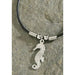 This necklace is on a black rubber cord with a pewter pendant and measures approximately 18" in length.