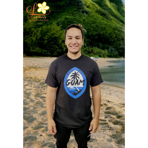 Men's T-Shirt Black with Guam scenery and Hafa Adai design.