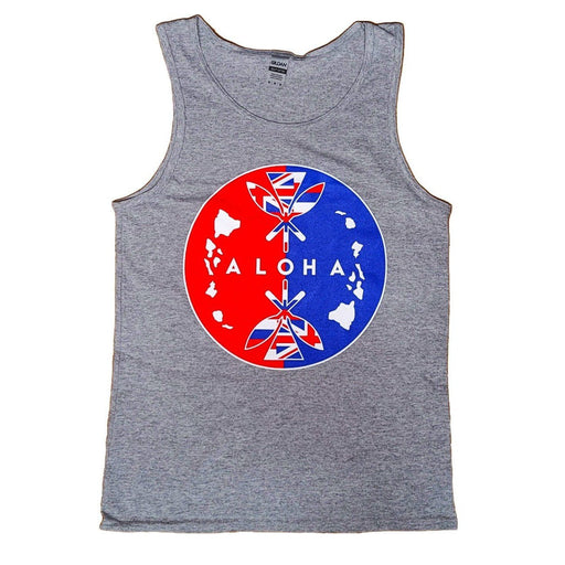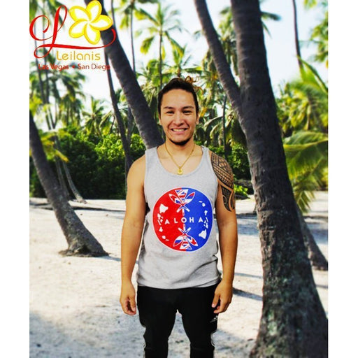 Men's Tank Top Grey with Aloha Hawaiian Flag and Island design.  Perfect for the warmer months.