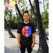 Men's Black T-Shirt with Aloha Hawaiian Flag and Island design.  Hawaiian Islands in the Colors of the Hawaiian Flag.
