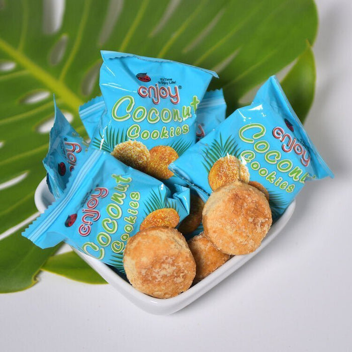 Crunchy Enjoy Coconut Cookie, a perfect tropical snack. Taste the coconut flavors in each bite! They are: