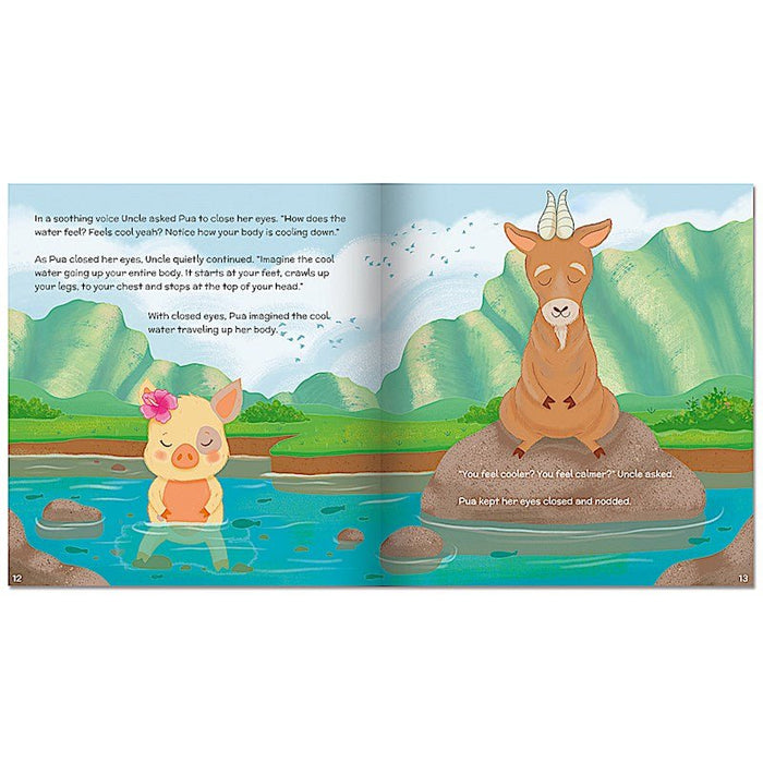 Pua is a young puaʻa pig growing up on the beautiful island of Kauaʻi. Most of the time, Pua enjoys her sweet life, especially eating the tropical fruits in her valley. But sometimes, Pua gets mad. So mad that her thoughts and feelings get all “kapakahi” or mixed up and she has tantrums. One day, her wise Uncle Pono teaches her a mindful meditation to calm down, clear her mind, and manage her feelings and body. Through this simple exercise, Pua is reminded that she is connected to nature and the ʻaina all around her. A skill that will last a lifetime.
