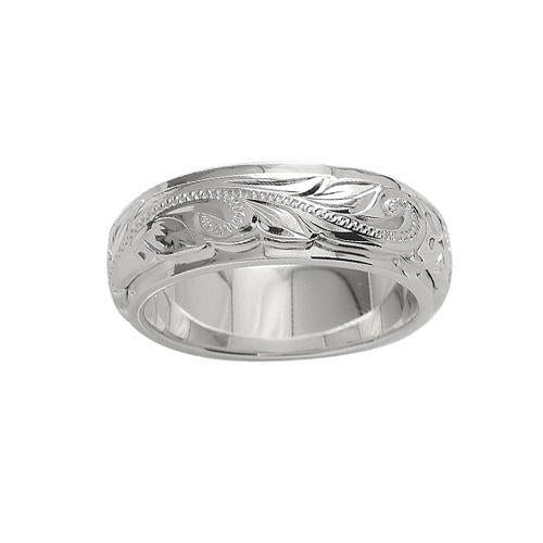 Sterling Silver 8mm Hawaiian Plumeria and Scroll Ring with Plain Edge. The 8mm ring is made with sterling silver and high polished to avoid tarnishing. It is engraved with Hawaiian Plumeria and Scroll design. Size 6-12 are available. Always appropriate and gorgeous, this ring is a timeless classic, and it belongs in every jewelry wardrobe.