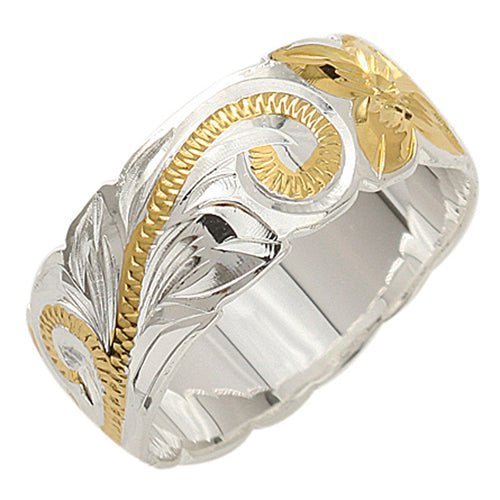 Sterling Silver 6mm Two Tone Gold Hawaiian Plumeria and Scroll Ring with Cut-Out Edge. The 8mm ring is made with sterling silver and high polished to avoid tarnishing.