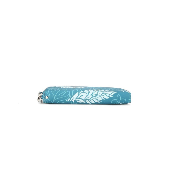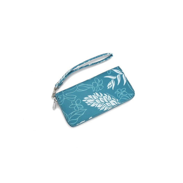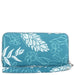 Hold all your essentials in the palm of your hand with the Kaylee Wallet! The wallet has a detachable wristlet strap, 8 credit card slots, 2 side pockets for paper money, 1 zipped coin divider, and 3 separated inside compartments. This wallet is also large enough to hold a passport and phone, and it is RFID protected to keep your cards safe! Our exclusive Ginger print in teal is the perfect compliment to your purse or outfit!