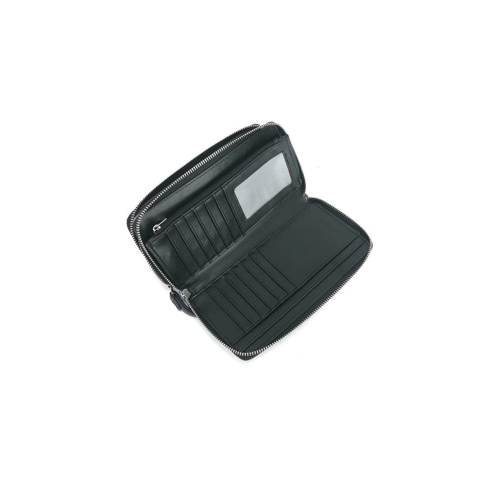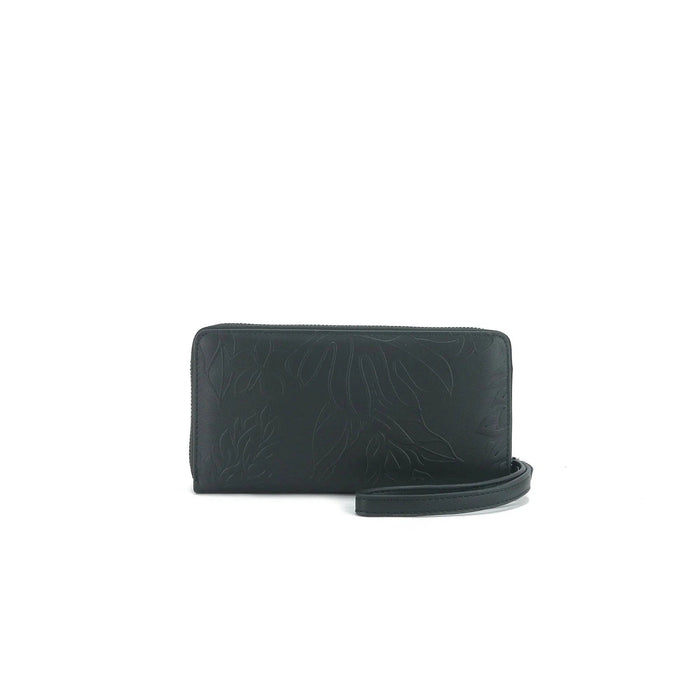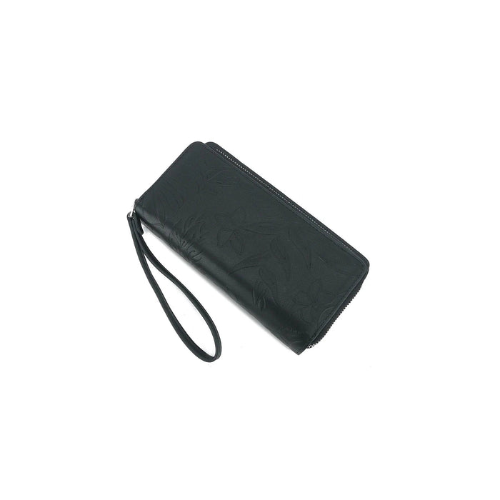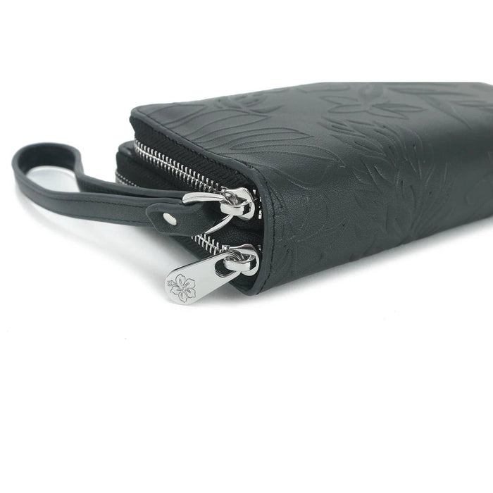 The Allison wallet offers a compact way to carry your essentials! This wallet will protect your credit and debit cards with RFID protection. The wallet has 14 credit card slots, 1 zipped coin compartment, and 3 separated inside pockets large enough to fit all types of currency. We also have a zippered front pocket to hold your phone or similar items and it features a stylish wristlet strap as well! The exclusive ginger pattern in an embossed black makes for the perfect addition to your purse or outfit!